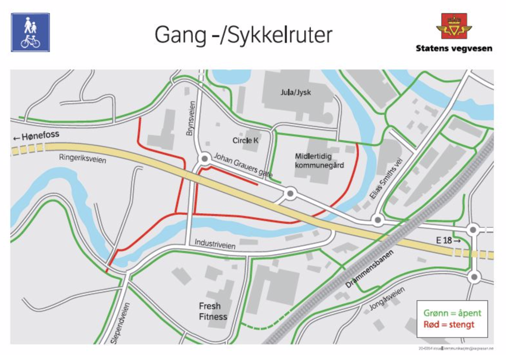 Når disse broene er borte skal det bygges en ny Bjørnegård bro, som vil være både bredere og ligge høyere, slik at Brynsveien kan møte Ringeriksveien i ny rundkjøring. Stengingene vil medføre endringer for gående og syklende. Gang- og sykkelveien stenger langs Sandvikselva fra Bjørnegårdsvingen frem til BI-brua. Det er satt opp kart ute. I henhold til støyforskriften T1442 kan anleggsarbeidene pågå hverdager 07-19, men pigging kun frem til kl.17.