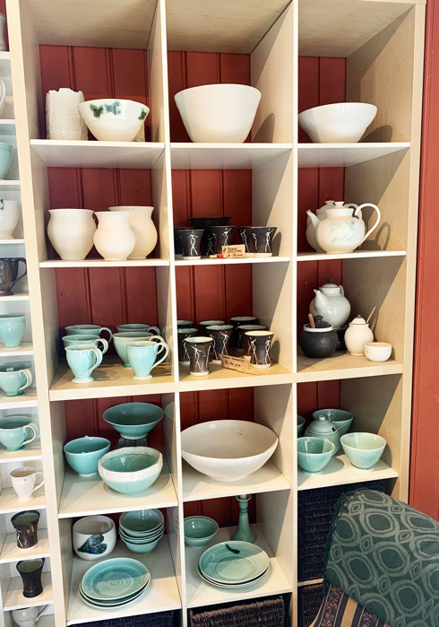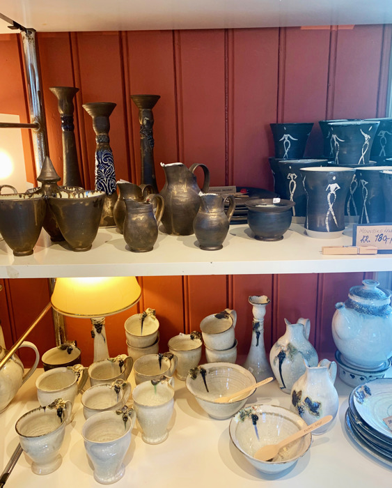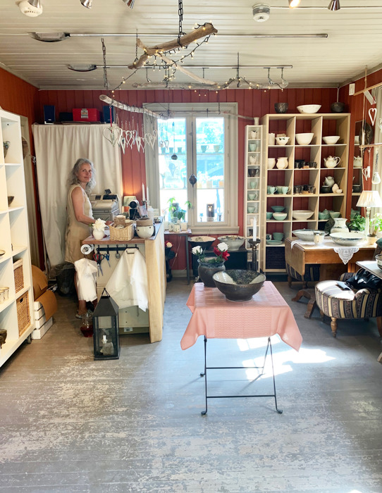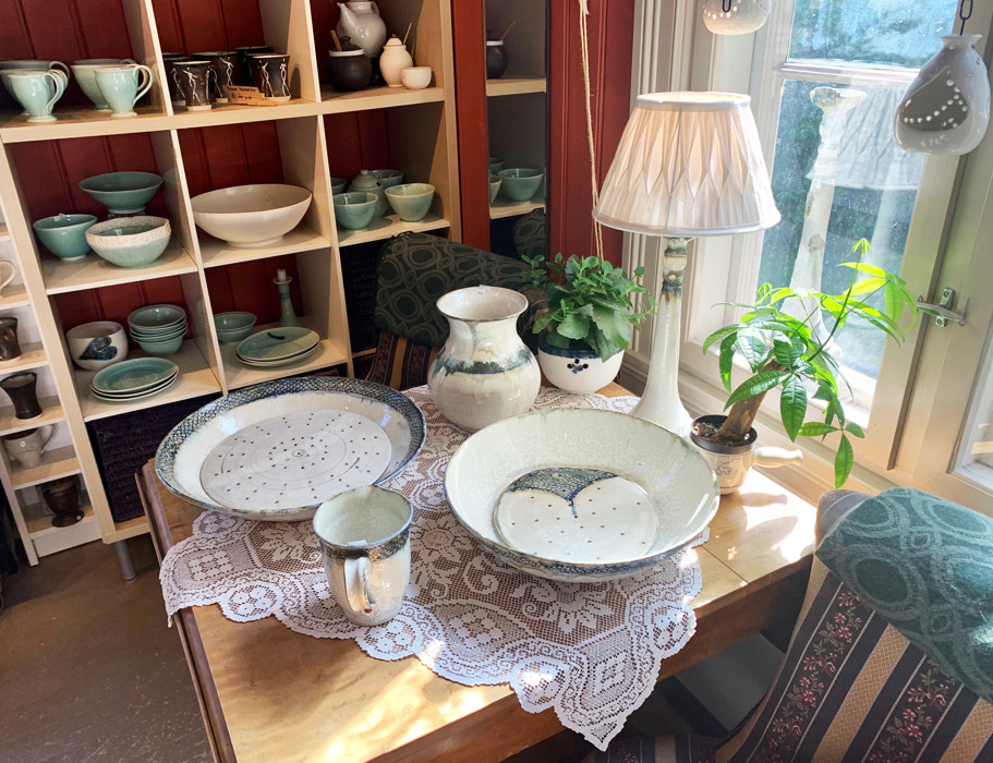 Det gamle trehuset oser av historie og atmosfære - her trives hun godt. Innerst i lokalet har hun sitt lille verksted, og utenfor en innbydende, trivelig butikk med vakre utstillinger av en mengde flotte produkter. Her er stor variasjon - med alt fra kopper, tekanner og krus, via lykter og lysestaker, til vaser, boller og store krukker. Mye er holdt i sobre, lyse nyanser - blant annet lys turkis, hvitt og beige, men her er også sort og brunt og mønster av mange slag. EB har utarbeidet en egen teknikk der hun bruker gammeldagse krumkakejern og gorojern til å lage mønster på enkelte av produktene; noe som gir en helt unik, spennende effekt.