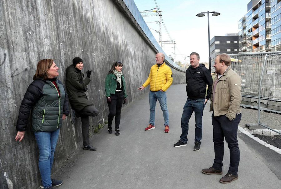 (Kristin Bjelke (fra venstre), James Finucane, Hanne Ugelstad, Nikki Schei (MDG), gatekunstner Thomas Stønjum og Ola Helmich Borchgrevink Pedersen (Ap) vi ha gatekunst på flere murer og vegger i Sandvika – som denne langs jernbanen. FOTO: TRINE JØDAL)
